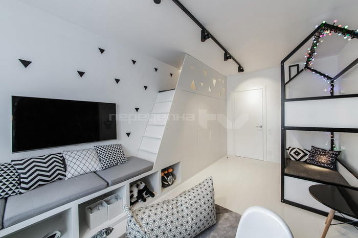 Только у нас потолок 3 метра, а значит там можно встать ребенку. И стена черная - это же пещера))) И телевизора в комнате нет, т.к. дети смотрят только через проектор мультики в отдельной комнате. И будет рулонная шторка на входе.