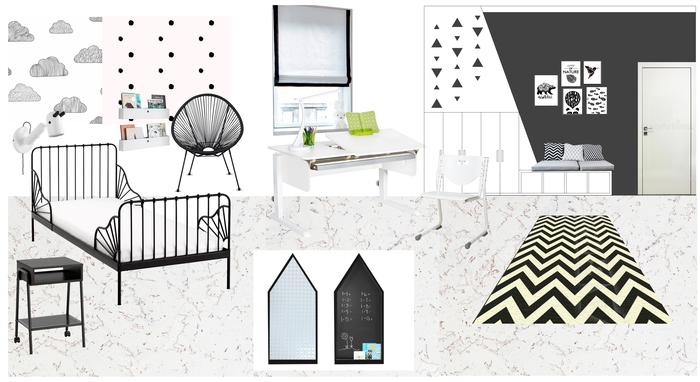 Тут то все и встало на свои места. Любимые цвета: черный, белый и красный, что не удивительно при ее темпераменте. Поскольку детей четверо, а места пока мало всем крайне хотелось личное пространство, укромное местечко, даже в рамках своей комнаты. Мы обсудили этот вопрос с родителями, они были не против, только решили отказаться от "конкретных" образов: пещера, дерево, замок, а прибегнуть к стилизации, чтобы фантазия работала.