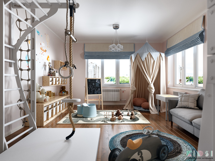 Цветовая гамма - это дело вкуса. Комната солнечная, что не удалось передать на 3Д, вопрос с поиском визуализатора открыт :) Да и в целом, как мама и художник, я уверена, что спокойные богатые оттенки помогают развить умение их видеть. И комната должна быть легко изменяема по цвету. Захотелось яркости: поменяли шторы, наклеили наклейки на комод и шкаф, кинул яркое покрывало и готово.