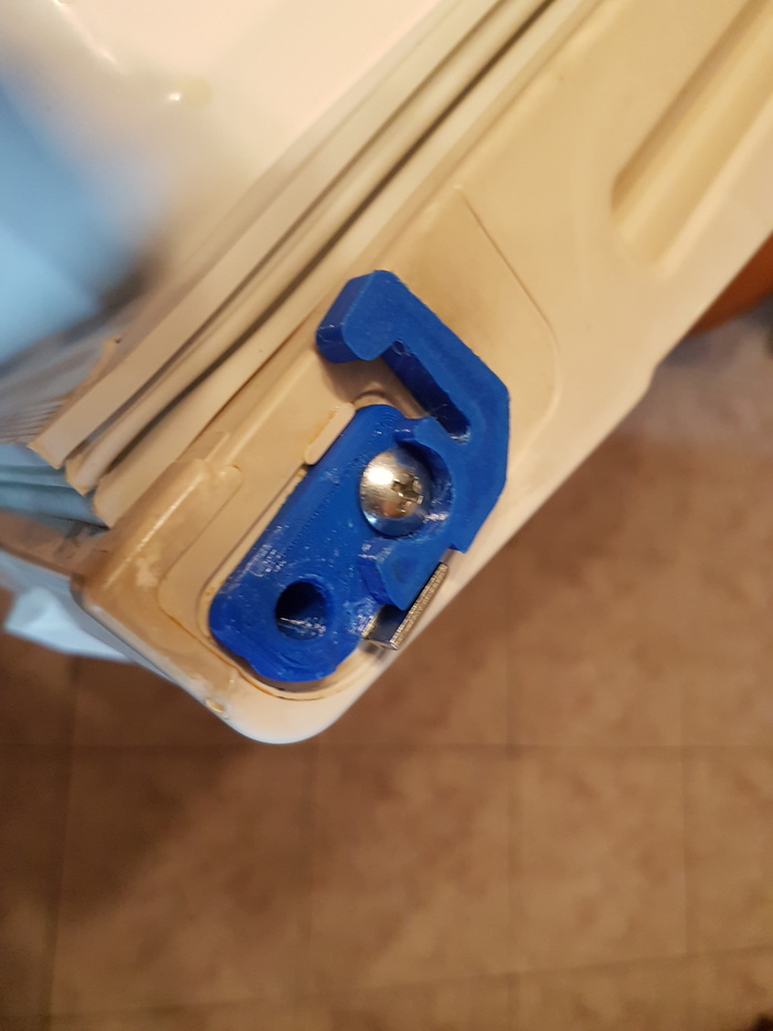 Ну вот, таки у меня сломалась эта штука, пару раз случалось так, что дверь морозильного отделения была приоткрыта и перестала нажимать на кнопку . Что происходит в этом случае? Выключается вентилятор который гоняет воздух по холодильнику. Что произойдёт дальше если вы не заметите этого события и уйдёте на работу к примеру. А произойдёт следующее Испаритель который производит холод обмёрзнет до состояния монолитного куска льда, закупорит воздуховоды которые скрыты от наших глаз и цивилизация пельменей будет обречена на гибель. Даже система само разморозки которая включается раз в сутки не сможет тут помочь, придётся выключать холодильник и ждать полного растапливания образовавшегося льда, а это больше суток!! Я не стал допускать гибели цивилизации пельменей и колонии мороженных грибов. Снял дверцу, отвинтил поломанную деталь, приклеил дверцу обратно при помощи молярного скотча и пошел проектировать сломанную деталь. Была сложнейшая печать на малой скорости и деталь очень была капризной и норовила то деформироваться то оторваться от стола принтера, но я победил в итоге её. И с чувством собственной гордости собрал всё обратно предварительно оторвав поддерживающие элементы от детали и обточив неровности надфилем. И цивилизация пельменей была спасена. Всё работает и уже есть модель запчасти в архиве.