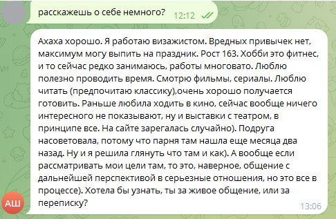 Сам понимаю, что расспросы о человеке со старта выглядят банальным. Но если анкета пустая, то сами напросились. Я всегда стараюсь найти что-то в анкете или на фотографии, о чем можно завязать разговор. Если так случается, то беседа идёт до поры. Но как правило беседы обрываются, будто пользователь на том конце внезапно был дезинтегрирован из плазменной пушки и больше не может ничего.