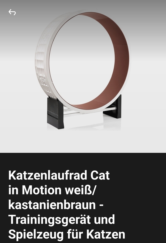 Ну у меня то уже идея загорелась - направить энергию моего Абиссинца в нужное русло, ну может быть и Шотландке жирок растрясти. Начала искать везде где можно эти колёса. Цены оказались кусучими, а нравящиеся колеса в основном производились в России и доставка в Германию была бы проблематичной😥 Но тут видимо алгоритмы гугла и рекламы сообразили, чего требует моя котовья душенька, и подкинули мне рекламу местных сайтов с этими шайтан-агрегатами.