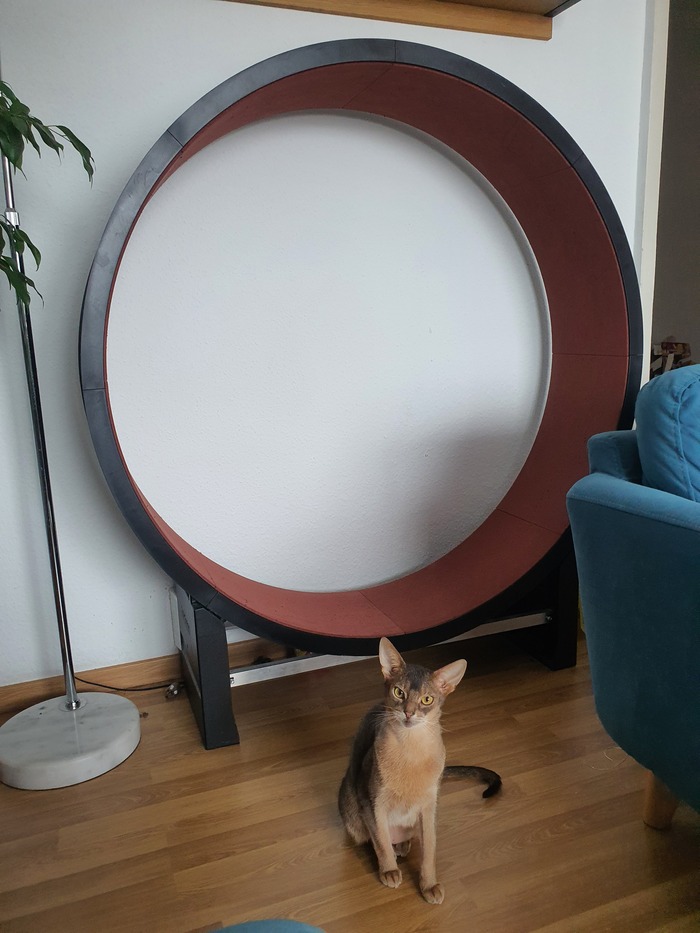 Собирать этот конструктор было довольно забавно: жёсткий пластик, болты, покрытие на клеевой основе. Коты естественно офигели от новой бандуры дома и смотрели в её сторону настороженно. Разместила колесо в коридоре и дала пару дней на притирку. Потом начала "приучать" кота.