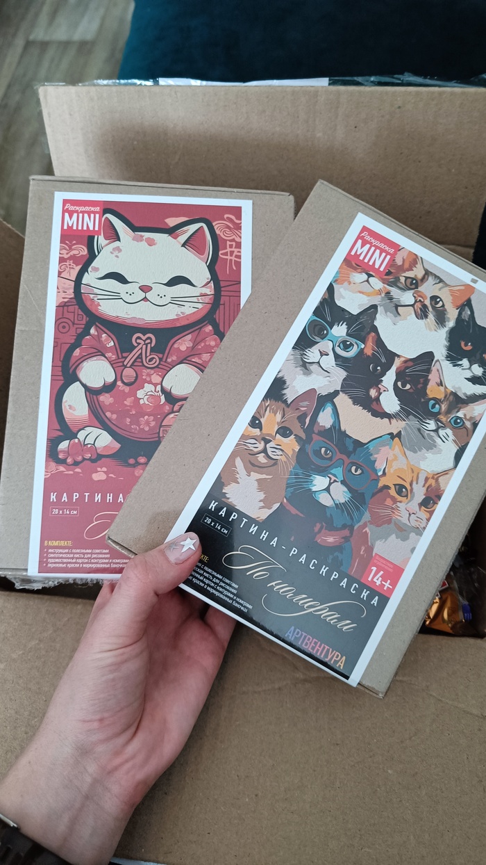 Рука сразу потянулась к коробке с котами, неожиданно внизу скрывалась еще одна похожая коробочка. 2 картины по номерам с котами. Т.к.люблю котов, мне зашло:)
