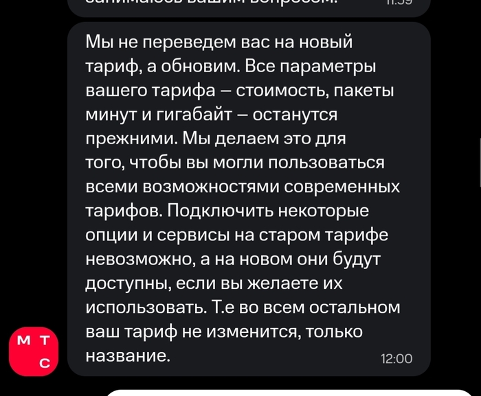 Итак, до декабря прошлого года я пользовался тарифом "Тарифище", с 2018 года. Его стоимость периодически менялась, и в декабре составляла 820 руб. И вот мне приходит смс, что мтс больше не может поддерживать тариф с таким названием и им необходимо это название сменить.