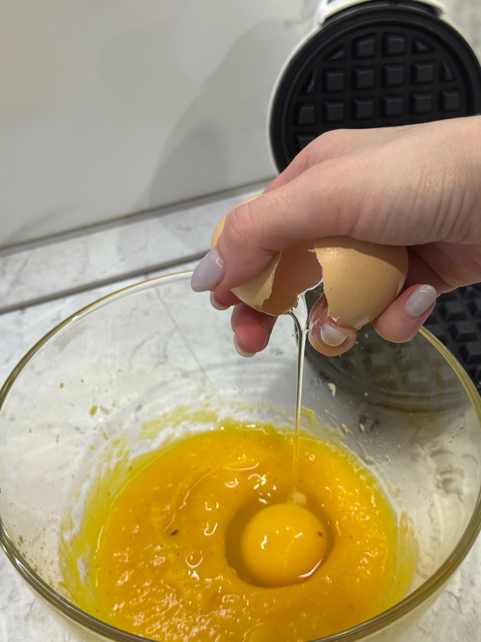 Вводим по одному яйцу, каждый раз тщательно взбивая.
