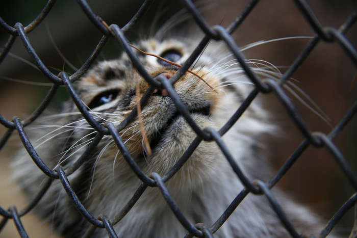 С суровым взглядом, грозным урчанием и длинными когтями. С одним мы познакомились через сетку, когда он лапами пытался утащить камеру. Придвигала объектив вплотную к решетке, чтобы "размазать", котику или кошечке это сильно не понравилось. Верю, что пальцы и другие части тела могут откусить на раз. Скорость от "я иду, никого не трогаю" до яростного нападения секунды.