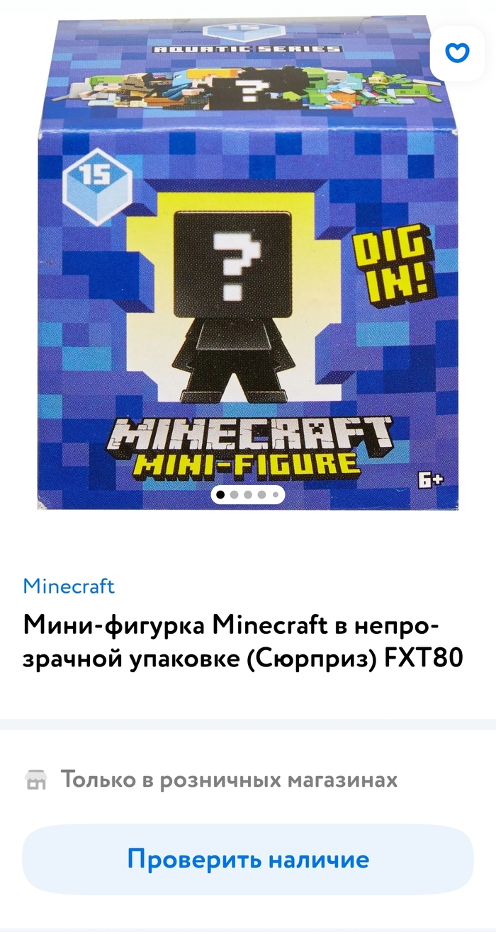 - основная информация по игрушке для сотрудников Детского мира : название Мини-фигурка Minecraft в непрозрачной упаковке (Сюрприз), Артикул FXT80, Код товара 1000105495. Именно такой код товара и артикул, а то многие сотрудники приносят другие игрушки, очень похожие, но они сборные, с крупными головами как у фанкопоп, ну и стоят гораздо дороже. Видимо их Mattel выпустила на замену тем, которые собирает сын;