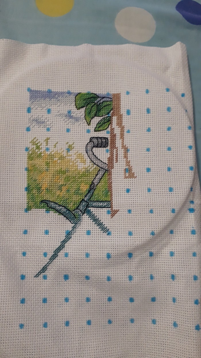 Первым вышился осенний кот. В процессе было сломано пару иголок при закрепе ниток в конце и стало понятно, что перед работой отверстия в основе нужно хоть немного прочищать, т.к. светлые нитки пачкались.