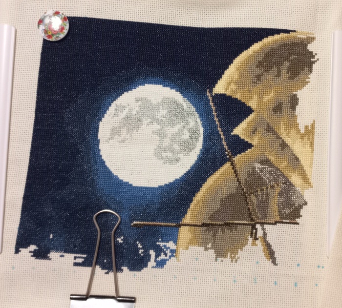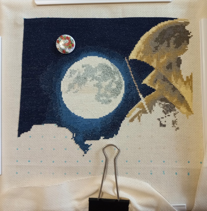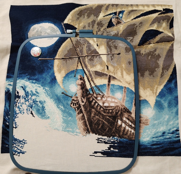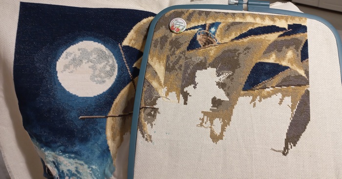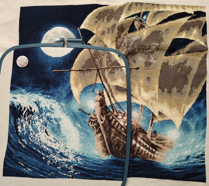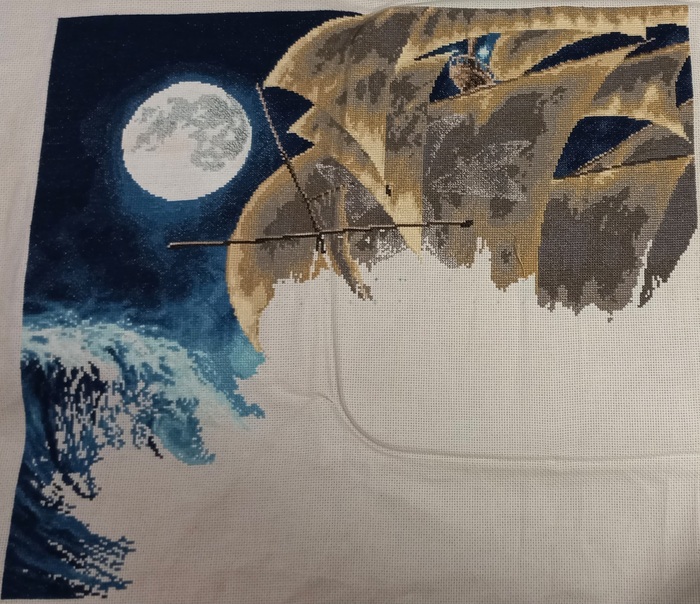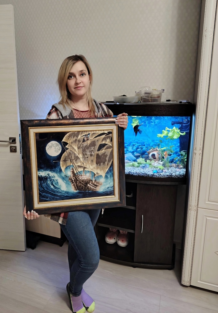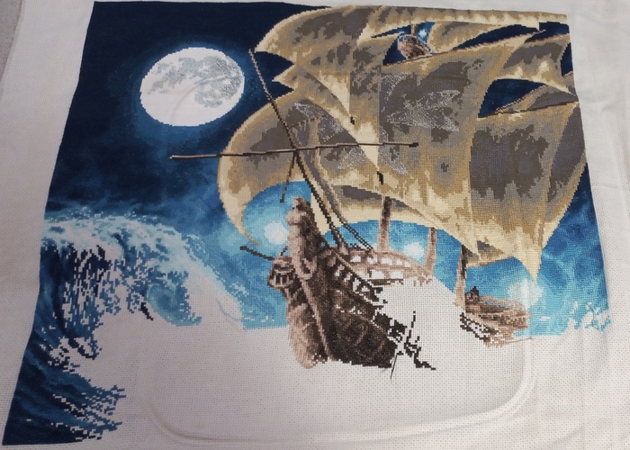 И вот в начале этого года я таки закончила этот многострадальный процесс. Готовая работа превзошла все ожидания. Корабль красивый, луна и окошки светятся, металлик блестит. Муж сразу сказал, что повесим над аквариумом)