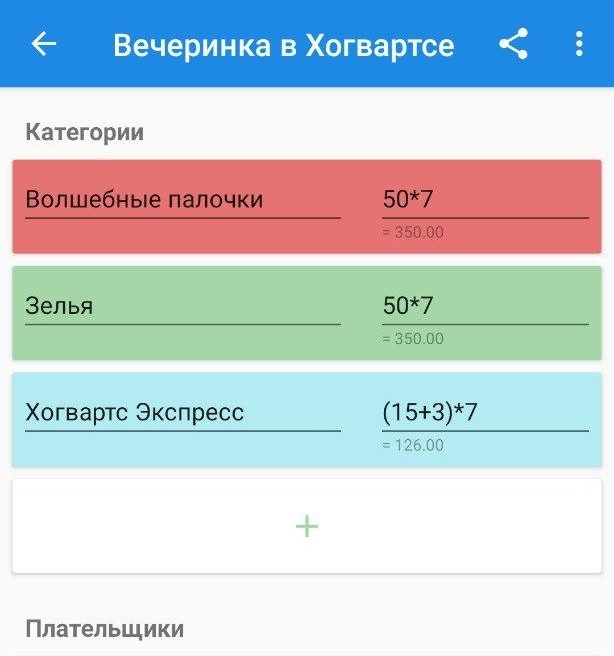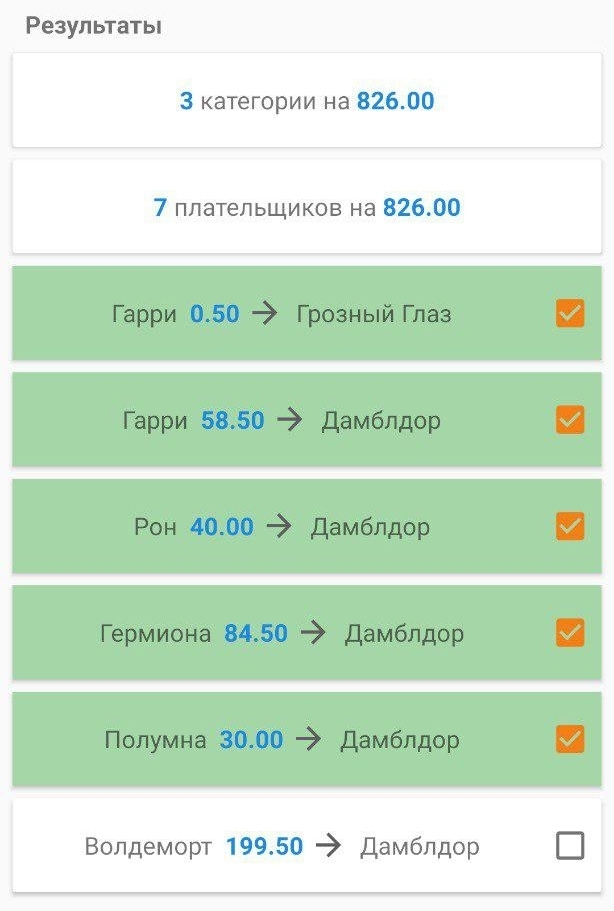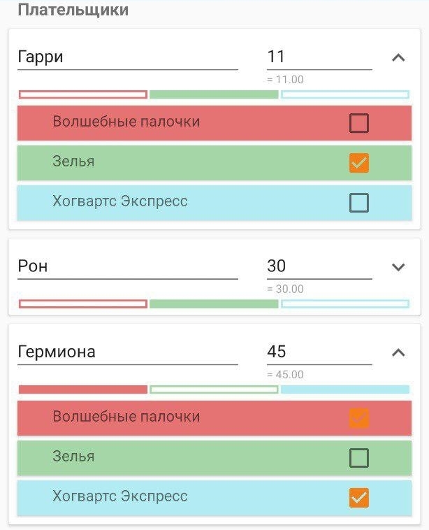 3. Тем же макаром вводим плательщиков и указываем, кто что употреблял. А чтобы видеть это всё в свёрнутом виде, закрашиваются прямоугольнички, если категория выбрана: