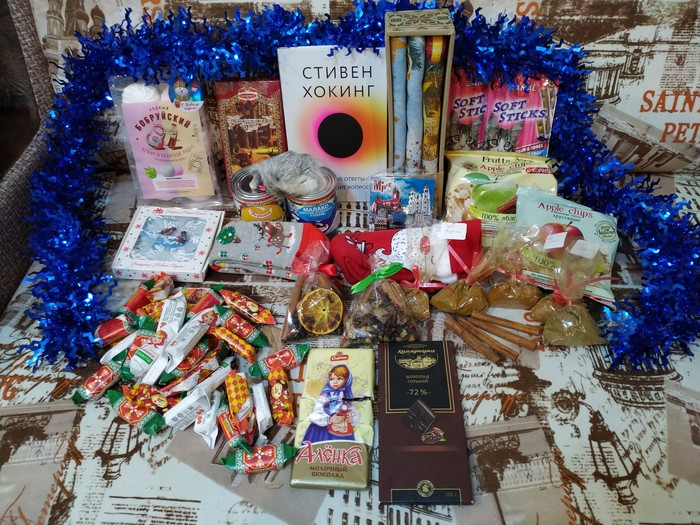 Дед Мороз Артем из Минска ты просто волшебник!!. Или я была очень хорошей девочкой. Ты учел все мои хотелки и даже больше. У меня страсть к носкам, очень люблю всякие носки, обожаю зефир и книжку Стивена Хокинга хотела. Спасибо за приправы. Уже давно хотела сварить глинтвейн, теперь не отвертеться, будем пить его в праздники. Наша кошка Буся заценила игрушку и вкусняху, ей понравилось. Спасибо за сгущенку и за полотенчики из льна и за шоколадки (правда Аленка не перенесла транспортировку, сломалась, была съедена в первую очередь).