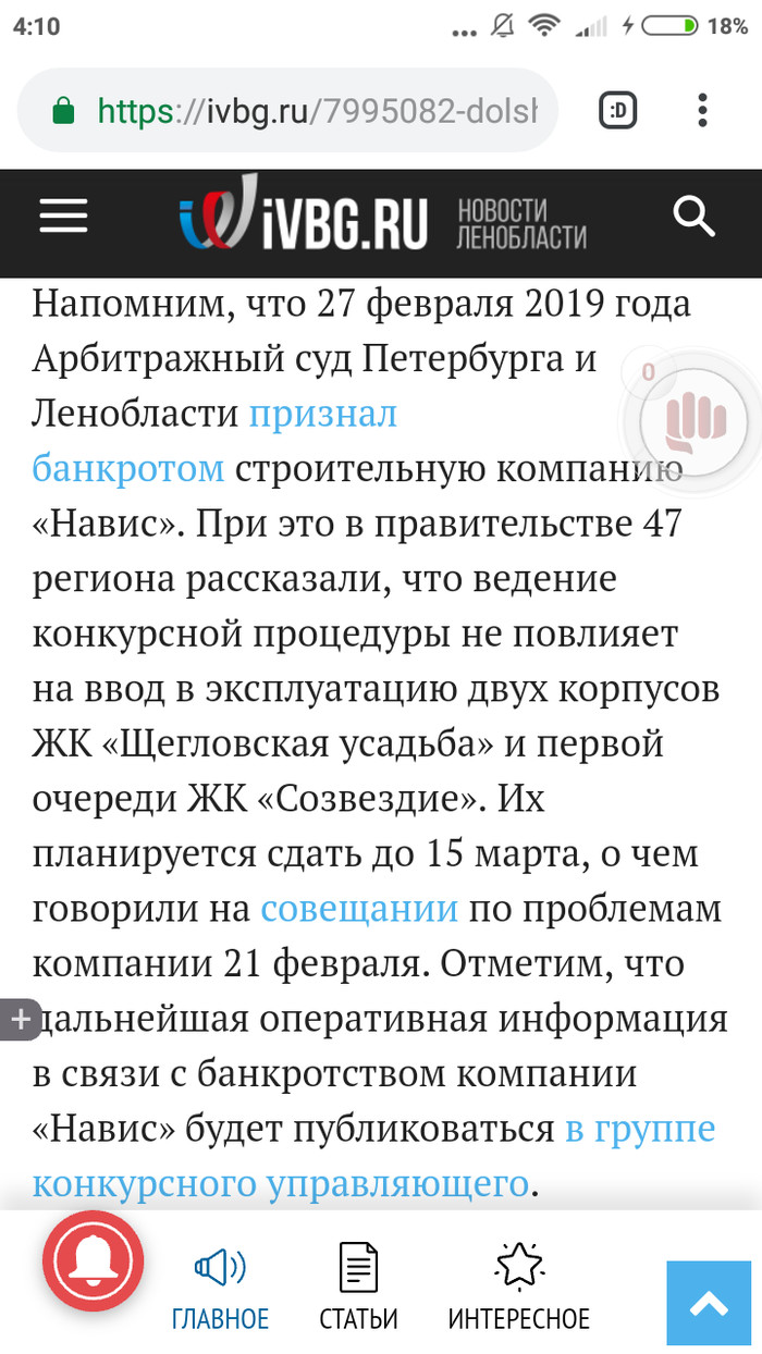 2. Внезапно, как гром среди ясного неба, произошел суд по банкротству застройщика "Навис", 16.03.2019 объявление о банкротстве опубликовали в Коммерсанте. На 19.03.2019 был назначен суд по банкротству и ЖСК "Созвездие". Губернатор и управляющий Нависа увещевали пайщиков, что банкротство ЖСК ни на что не повлияет.