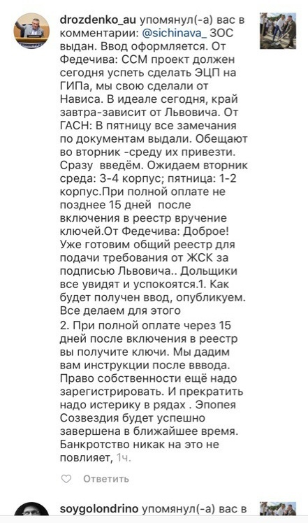 а) instagram.com/drozdenko_au, 18.03.2019: "Банкротство ЖСК Созвездие на сдачу не повлияет!",
