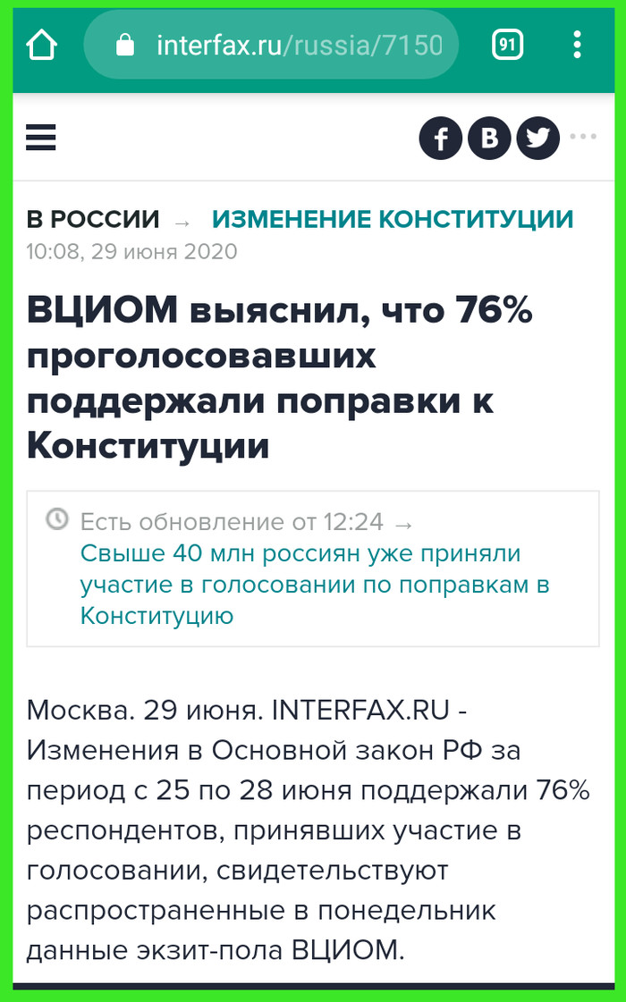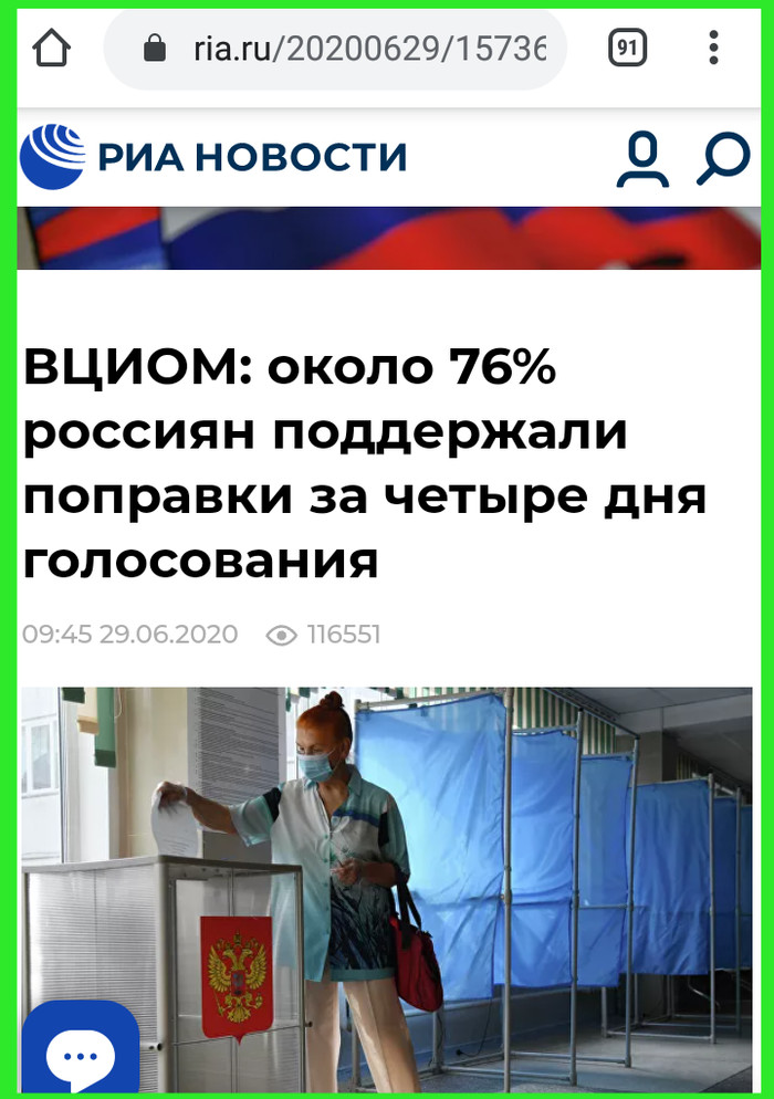 А РИА Новости и Российская газета додумались до вообще "76% россиян за". Это 106 миллионов человек. При этом на утро 30 июня всего проголосовало 49,6 млн россиян.