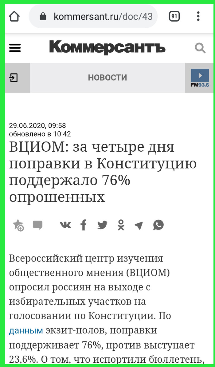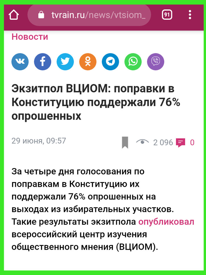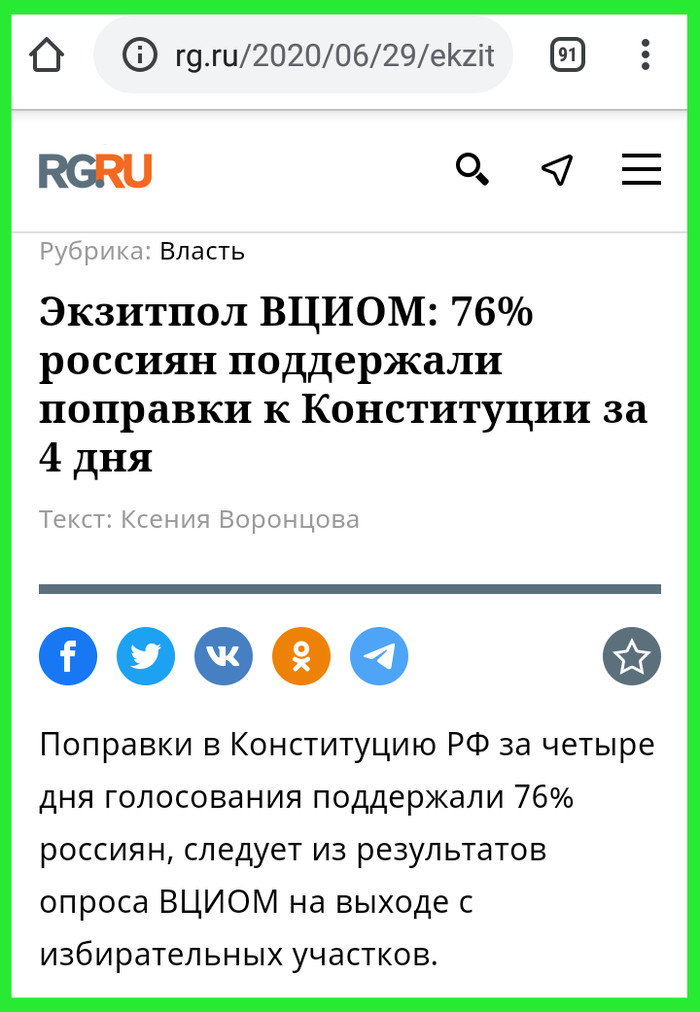 1) Заголовок статьи с отчетом об экзитполах с сайта ВЦИОМ, в котором ошибочно написано, что поправки поддержали 76% опрошенных, а не 53%