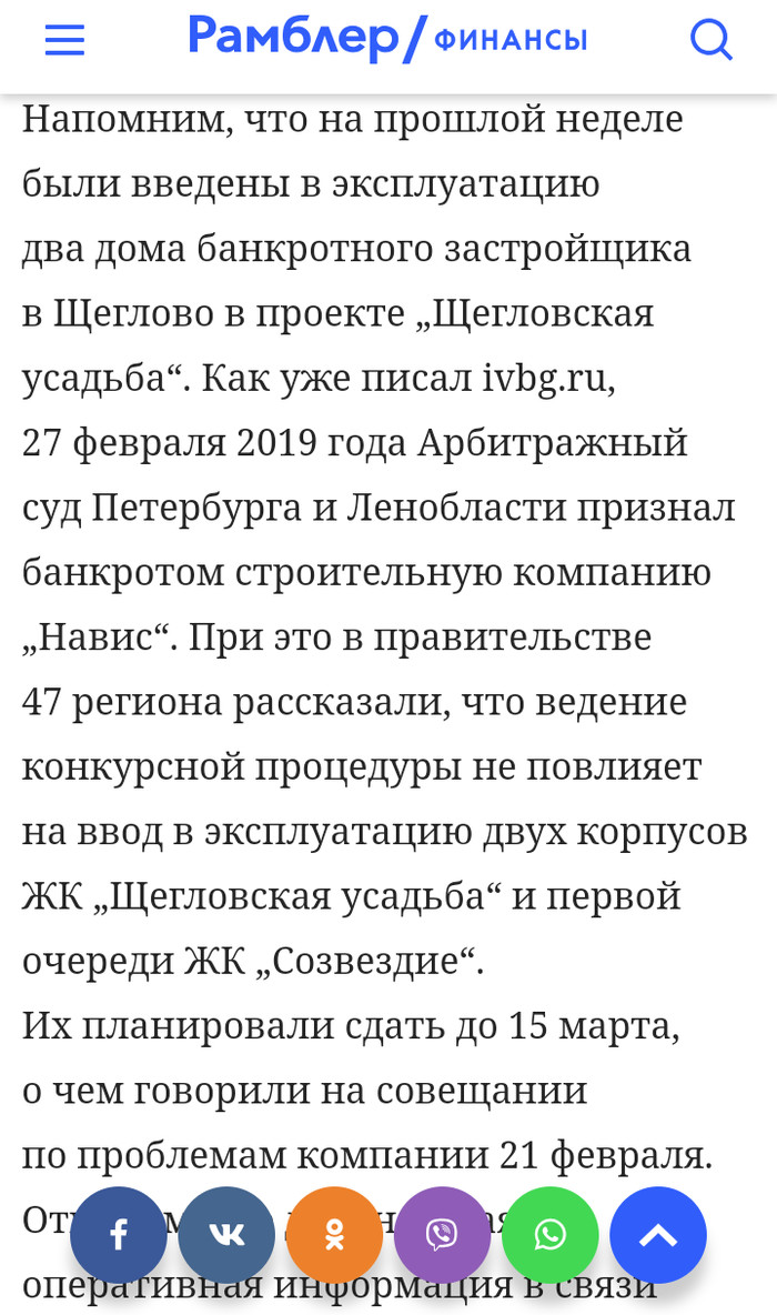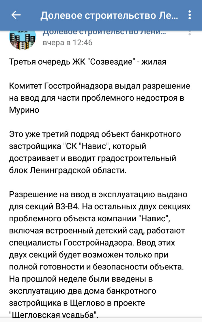 Вчера все знакомые и незнакомые люди стали поздравлять меня со сдачей дома, который был не сдан 4 года, и присылать ссылки на статьи, при этом, как ни удивительно, из официальных источников - с сайта Правительства Ленинградской области, из официальных групп СтройНадзора ЛО, арбитражного управляющего моего застройщика Нависа - Д.В.Федичева (он же директор созданной губернатором ЛО А.Ю.Дрозденко государственной "Дирекции КРТ ЛО", подчинённой вице-губернатору по строительству ЛО М.И.Москвину); ссылки на федеральные СМИ, некоторые из которых мы, жители ЛО, считаем между собой проправительственными (всмысле, пишут по заказу правительства ЛО приукрашенную или вовсе недостоверную информацию, создают позитивный имидж руководства региона перед теми, кто тут не живёт и не знает, как на самом деле), а от некоторых я совершенно такого не ожидала, например, от Коммерсанта (правда, они опубликовали "перепост" с сайта правительства ЛО, а не собственный репортаж).