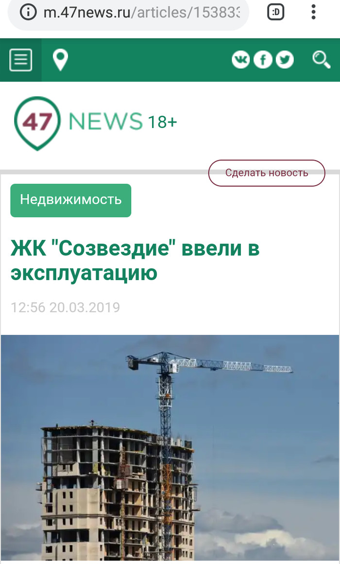 а) ivbgru, 47news, 07.03.2019: "Дольщики Созвездия могут готовиться к новоселью!", ivbgru, rambler, 21.02.2019: "Созвездие будет сдано до 15 марта! Заявили на совещании в Правительстве ЛенОбласти!",