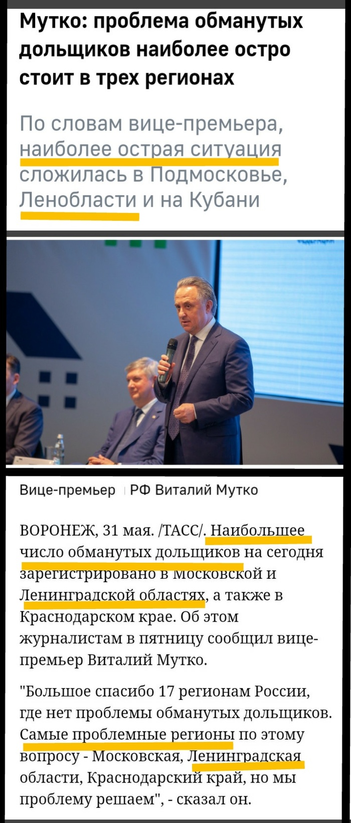 31 мая, в пятницу, вице-председатель правительства РФ по строительству Виталий Мутко официально объявил, что Ленинградская область признана одним из трёх самых проблемных регионов по обманутым дольщикам во всей России, кроме Московской области и Краснодарского края. И это при том, что в Омской области 1000 объектов незавершенного строительства, в Ростовской области 250, в Краснодарском крае 400, но мы в тройке!