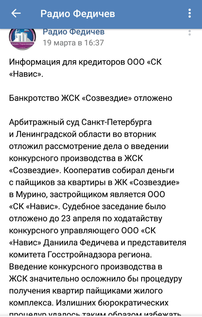 Федичев Д.В., 19.03.2019: "Суд был отложен по ходатайству Федичева, банкротство ЖСК Созвездие значительно бы осложнило процедуру получения пайщиками ключей, этого удалось избежать".