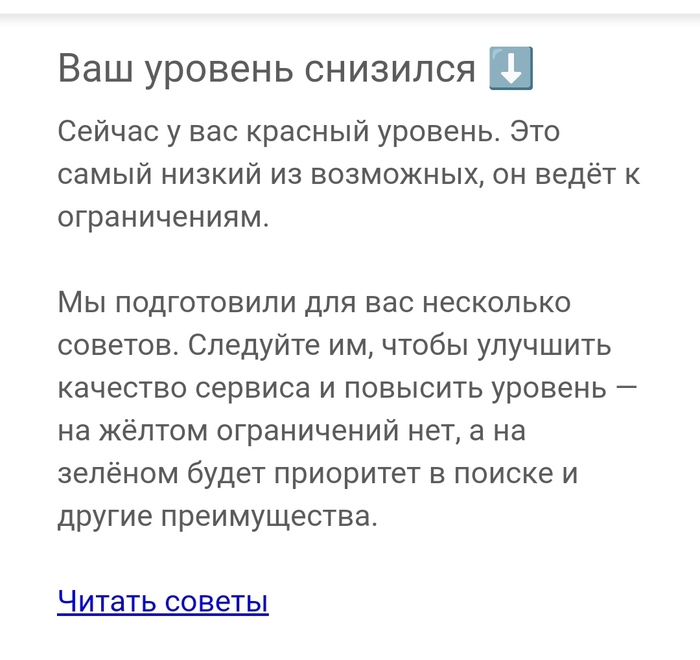 Сегодня пришло уведомление с Авито, что мой "рейтинг" опустился до красного уровня. Что это и почему - без понятия!