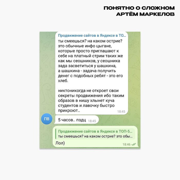 Как-то я разговаривал со знакомой, тоже из меркетинга и поделился с ней какой-то крутой штукой для агентства (всегда делюсь со всеми и всем). Она решила не оставаться в кармическом долгу передо мной и говорит: «А пошли я тебя познакомлю с человечком...». Мы подошли к нему, и Кристина представила нас. Говорит: «Привет человек, ты мне как-то говорил, что у тебя есть запрос на SEO, а вот это самый крутой сеошник, которого я знаю, если кто-то и может тебе помочь, то это он». Этим человеком был директор по маркетингу большого агрегатора для недвижки.