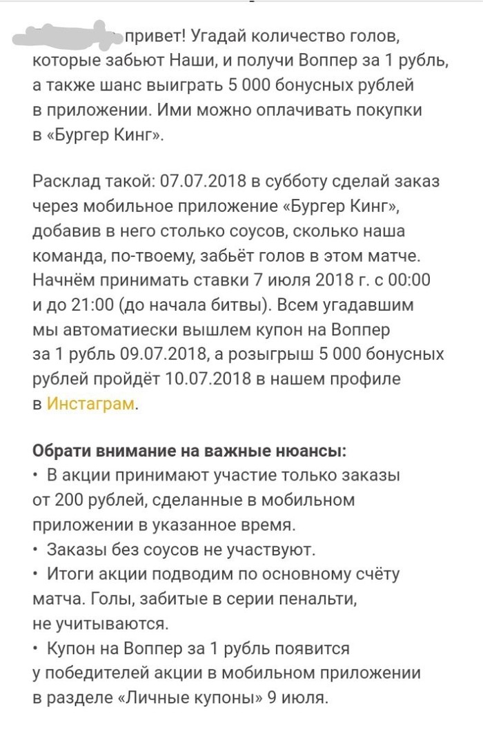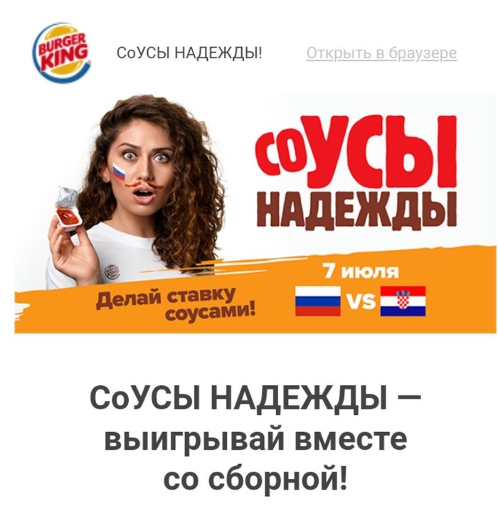 MarlaSinger32 Бургер-Кинг vs сборная России. 7 лет назад Бургер-Кинг проводит акцию. Только они окажутся в прибыли, если Россия завтра не забьет ни одного гола, так как заказы без соусов в акции не участвуют :D Показать полностью 2 [моё] Футбол Сборная России Бургер Кинг Длиннопост Реклама