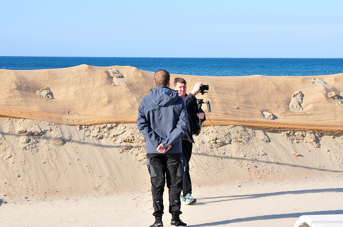 А вот здесь проведена большая работа. Волонтерам это вряд ли по силам. Здесь работала тяжелая техника. Вдоль пляжа сделана насыть из песка, которая закрыта сеткой и прорыт канал. Так же сетка растянута между каналом и береговой полосой. Труд не малый. Но и волонтеры присутствуют. Вылавливают всякую нечисть из нашего морюшка. Вот сколько не присматривался, так и не нашел, что ловить. А они могут. И вылавливают.