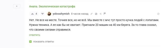 Ага. Не достоверная. На момент публикации всё так и было. Скажу больше. Я еще о многом умолчал. О криках души, о возмущении простых людей бездействиям властей. Простыми жителями Анапы, которые сразу же откликнулись на происходящее. Пришли без ничего. Кто с пакетами, кто с лопатой. О СИЗ никто и не думал. И никто не предупреждал людей, что это еще и опасно для здоровья. Это как Чернобыль тушить автомобильным огнетушителем. Но они пришли.