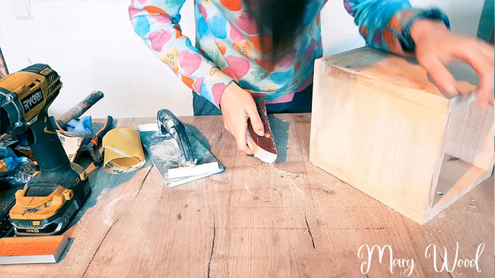 Заднюю панель я не сделала, потому что хотела сделать под нее паз, но фреза что была в комплекте сломалась. Можно конечно прикрутить ее на саморезы, но это не то, лучше тогда из фанерки или мебельного щита как-то сделать