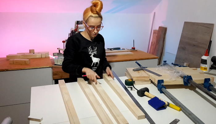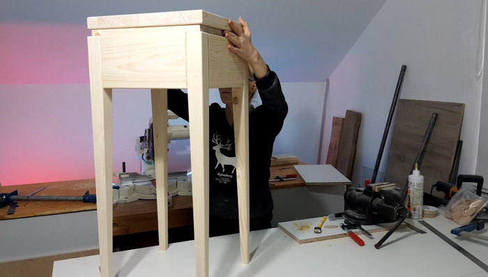 Т.к. сидушка и так достаточно толстая, вместо классического шип-паза я решила задействовать своего китайского друга (ламельник).