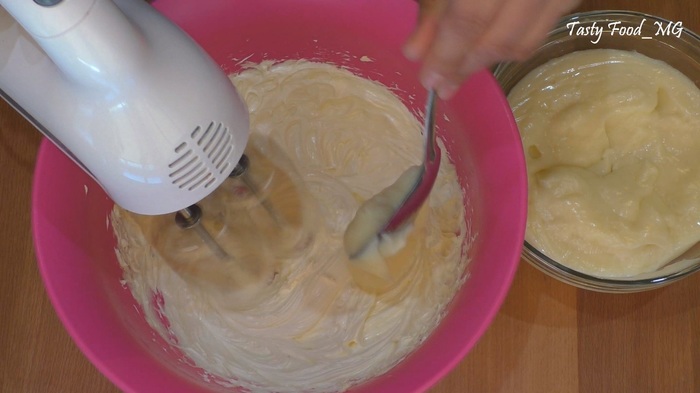 Чтобы приготовить крем муслин, взбиваем 150 г мягкого сливочного масла до побеления и пышности, затем постепенно, порциями, вводим остывший заварной крем и взбиваем миксером до однородности. Желатин заливаем 75 мл заранее прокипяченной холодной воды. Оставляем для набухания. (Делаем так, как указано в инструкции на упаковке.) Набухший желатин прогреваем до растворения на водяной бане или другим удобным способом. Вливаем еще теплую желатиновую массу тонкой струйкой в крем муслин и активно взбиваем с помощью миксера до однородного состояния.