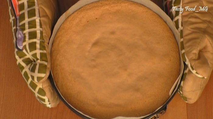 Противень застилаем бумагой для выпечки. Помещаем на противень кольцо от разъемной формы диаметром 22-24 см. Выливаем в форму половину теста. Выпекаем бисквит в хорошо разогретой духовке при температуре 180 градусов 10-15 минут (до «сухой спички»). Также поступаем с остальным бисквитным тестом. Готовые бисквитные коржи охлаждаем.