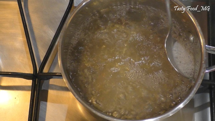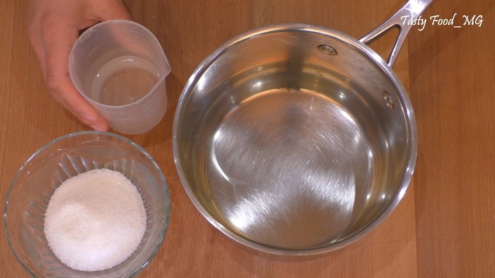 Готовим сахарный сироп для пропитки бисквита. Смешиваем воду с сахаром, доводим до кипения, помешивая, пока сахар полностью не растворится; затем даем сиропу полностью остыть.