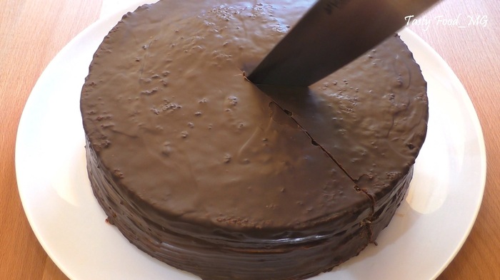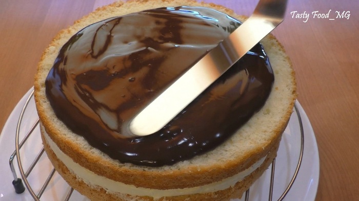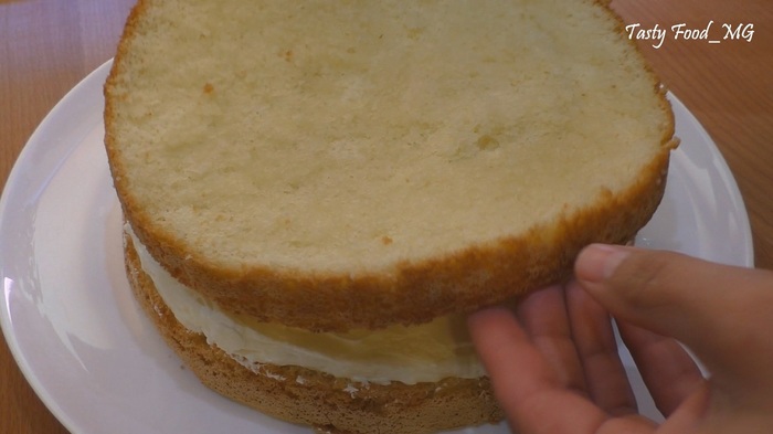 Сверху выкладываем крем и очень тщательно заполняем кремом промежутки между ягодными половинками. Немного крема оставляем для верхнего коржа. Накрываем вторым бисквитным коржом, слегка придавливаем, пропитываем его сахарным сиропом. Сверху наносим оставшийся крем. Затем убираем бисквитный торт с масляно-заварным кремом и клубникой на ночь или на 6-8 часов в холодильник.