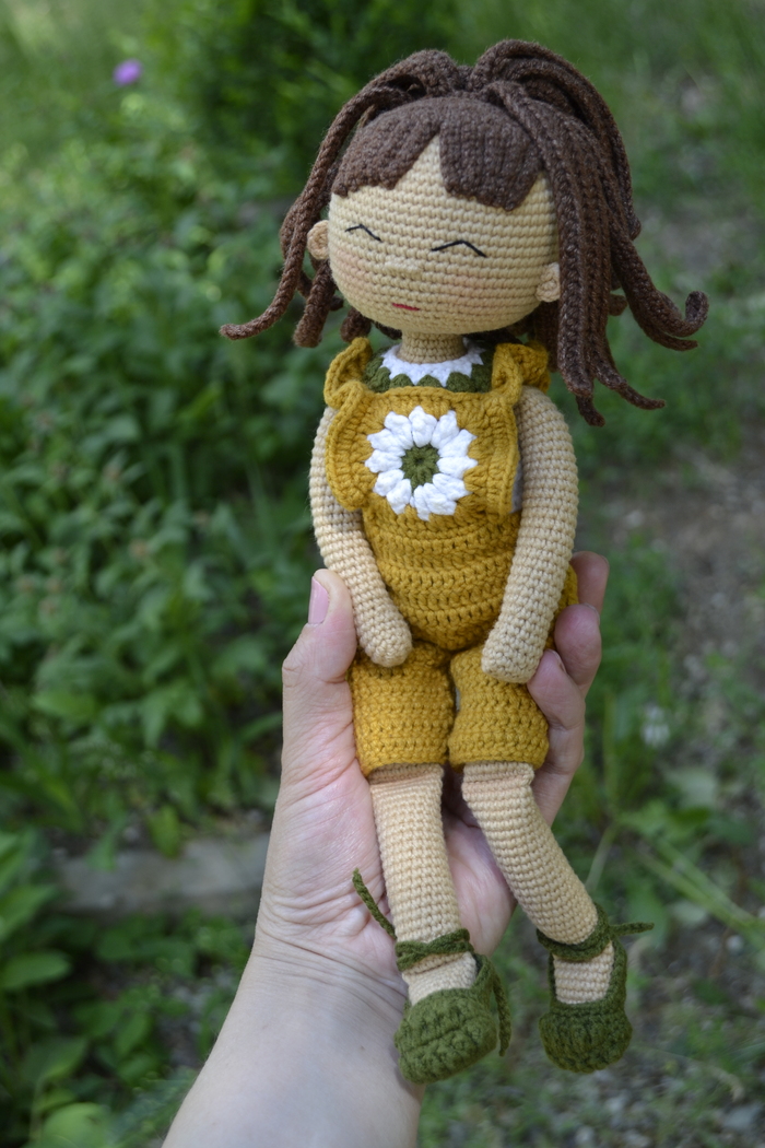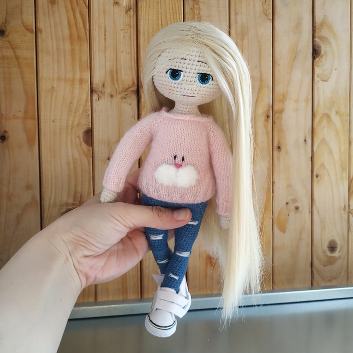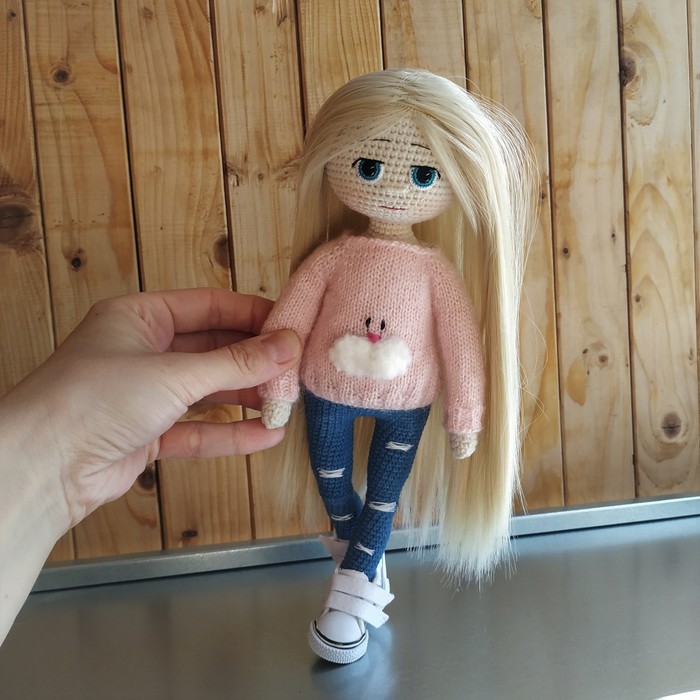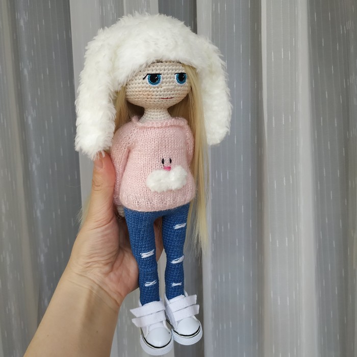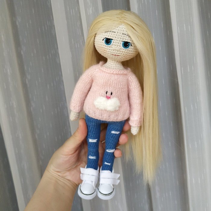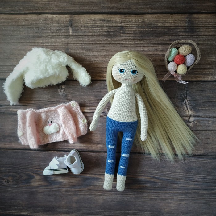 Сама кукла связана крючком, пряжа джинс. Одежда спицами.