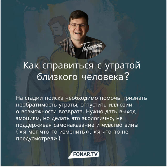 — Когда мы сталкиваемся с утратой, наша психика проходит ряд этапов, которые помогают справиться с потерей. Я использую методологию нашего соотечественника, психотерапевта и учёного Фёдора Ефимовича Василюка.