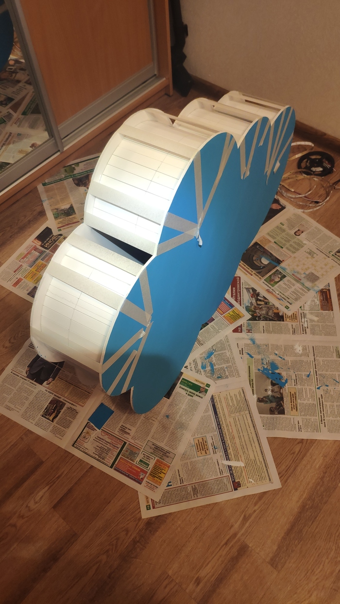 Далее нужно было сделать основание для светодиодов по всей длине облака. Я вырезал полосу пенокартона нужной длины и ширины. Затем сделал продольные прорези, чтобы прорезать первый слой картона. Эта заготовка отлично гнётся и держит форму. Такие полосы проклеил по периметру облачка. Стягивал всё малярным скотчем.