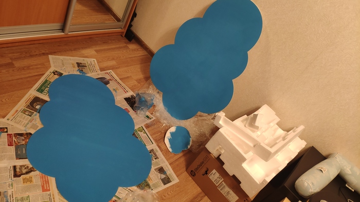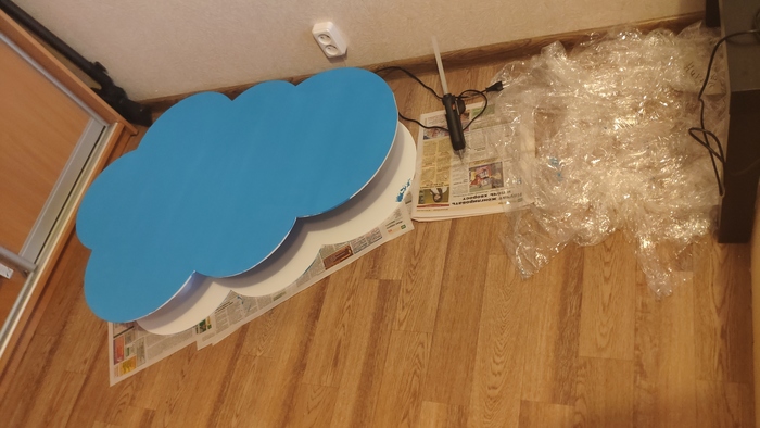 Ну и покраска. Как только все склеилось и подклеилось несколько раз, обклеил белый пластик малярным скотчем и мягким валиком покрасил в цвет боковины облачка. Цвет подбирал на глаз, вроде получилось похоже. Использовал акриловую краску и голубой коллер. Идеально было бы отколлеровать в цвет по HEX коду, но я не нашел где это сделать на таком маленьком объеме.
