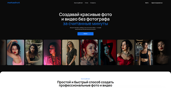 Для кого. Metashot полезен SMM-специалистам, которым нужно создать фотосессию с помощью нейросети и тут же превратить снимки в динамичный клип без стороннего софта.
