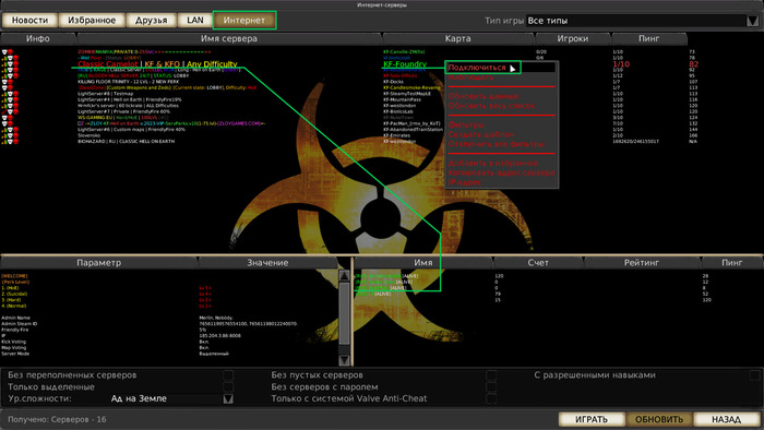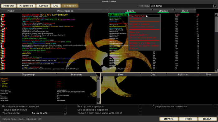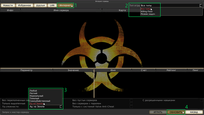 2 — «Тип игры» ставите «Все типы» (потому что если выбрать другое, то может и вовсе не найти серверов, а там уже многие сервера позволяют с помощью голосования менять режимы и сложность, вам главное найти сервер),