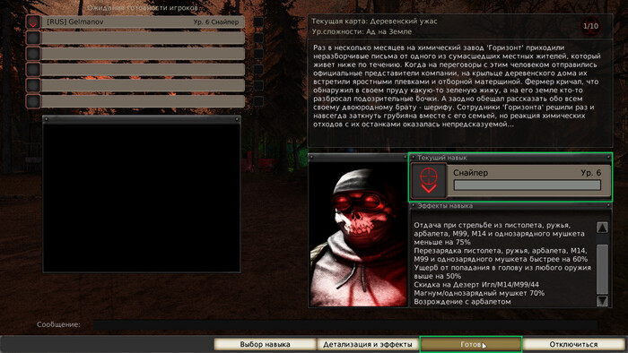 после вы окажитесь в лобби, в «Текущий навык» берете класс который вам нравится, нажимаете «Готов» и выживаете.