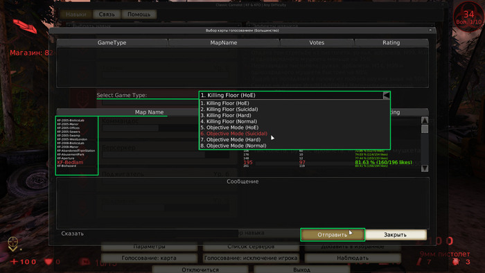 Определившись с трудностью и режимом ищите по спискам нужную вам карту и выбрав ее нажимаете «Отправить». Еще чтобы карта загрузилась нужно чтобы либо вы одни были в игре, либо большинство проголосовало «За» выбранную карту. Голосовать так же нажимая «Отправить».