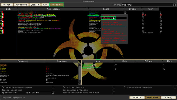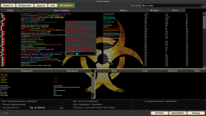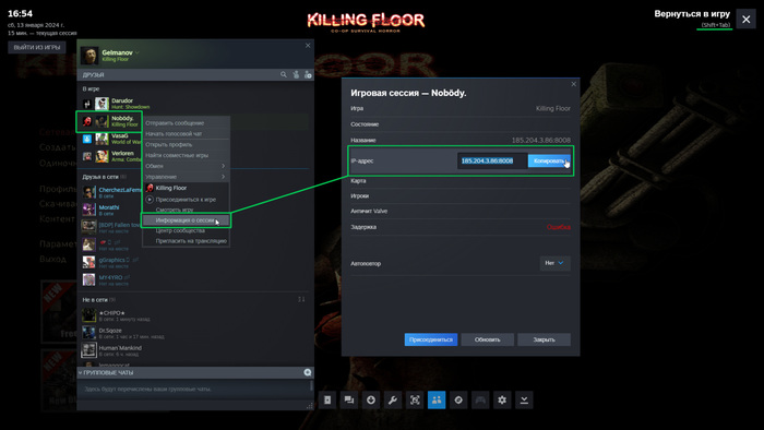 Допустим вы все-таки нашли сервер, играете, и тут ваш друг захотел к вам подключиться, но не знает, как? Для этого берёте заходите в Оверлей (Shift+Tab) открываете в нем список своих друзей, ищите того, кто играет в Killing Floor, затем кликнув ПКМ по имени друга выбираете «Информация о сессии», копируете «IP-адрес».