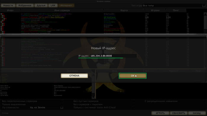 в высветившимся поле зажимаете «Ctrl+V (вставить текст)» тем самым заполняя строку адресом сервера, нажимаете «Ок» и залетаете к друзьям.