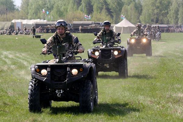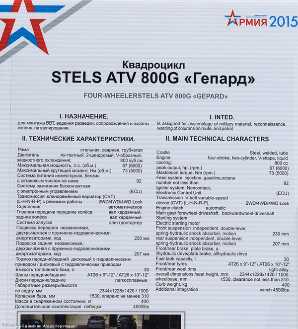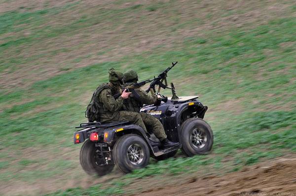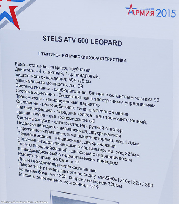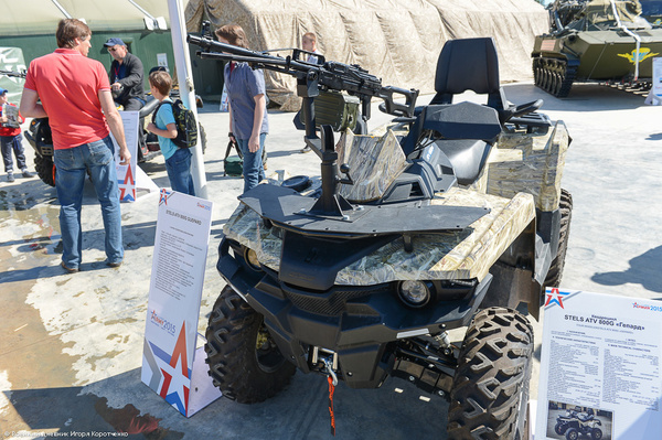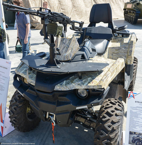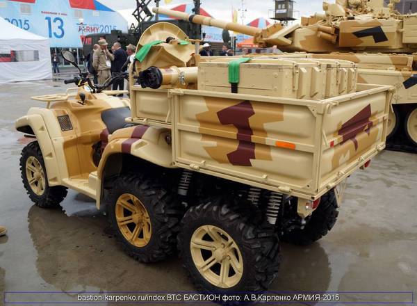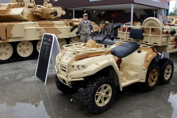 Комплектация для подразделений Минобороны также включает в себя систему крепления гранатомета и стрелкового вооружения - автомата АК-74 и винтовки СВД, передний кофр, в котором можно перевозить боезапас. Бензобак квадроцикла имеет самозатягивающееся покрытие, что исключает утечку топлива при повреждении его целостности. За пассажиром оборудовано место для размещения двух металлических канистр по 20 литров. Для действий в темное время суток, помимо обыкновенных световых приборов, мотовездеход оснащен фарой-прожектором.