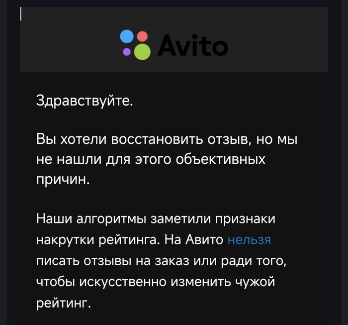 @Avito.help, что у вас там с алгоритмами вообще? Отзывы неадекватов вы удалить не можете, а нормальным людям наоборот хрен отзыв оставишь! Даже нечего сказать... Держите уровень конечно.