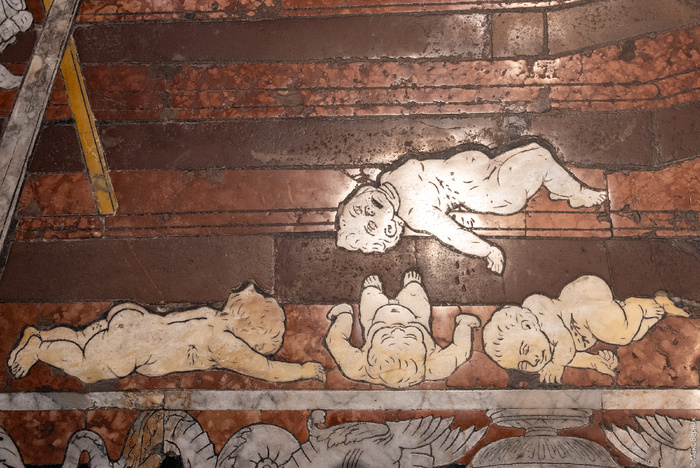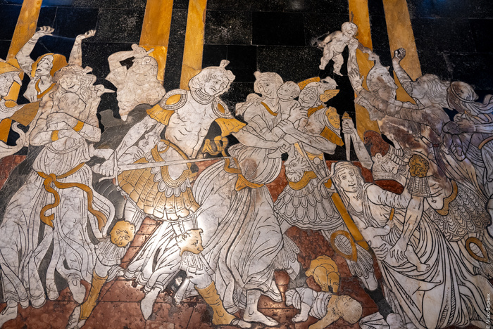 И опустим восторженный взгляд на уникальный мозаичный пол, гордость собора, работы над которым начались ещё в 14 веке, увидев перед собой самую эмоциональную мозаику собора – "Избиение младенцев".