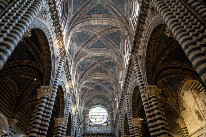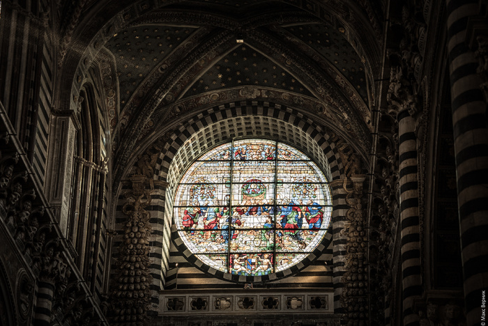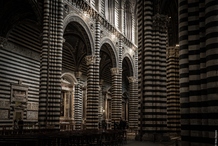 Далее взглянем на мраморный неф, уходящий в бесконечность, исполненный в характерной тосканской отделке тёмно-белым мрамором. Взглянем на игру света, на день и ночь, воплощённые в замысле архитектора.
