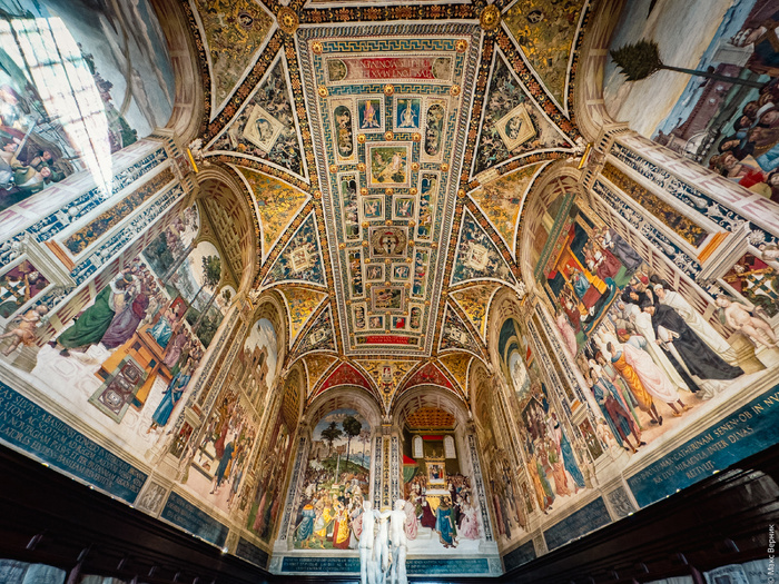 Чтобы осветить дорогу в библиотеку Пикколомини (впоследствии Пия Три – Племянника Пия Два), а там тоже не гвоздём сделано. Свернём налево и прозреем! Перед вами Рафаэлево дитя, или, как говорят скупщики на Арбате, вещь в работе – расписанные вышеупомянутым мастером стены и потолок. Сон, одним словом.